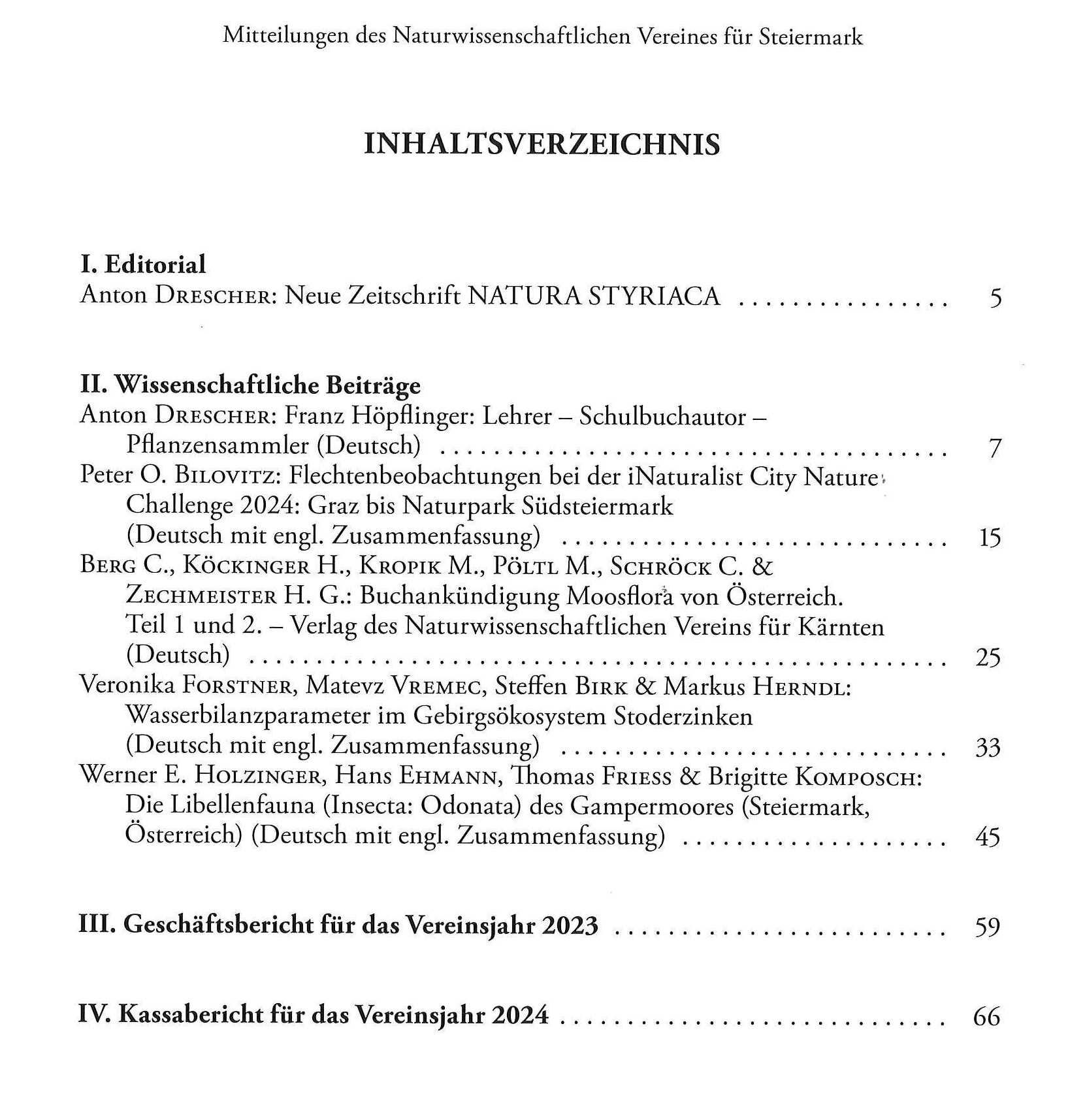 Natura Styriaca veröffentlicht Originalbeiträge, Reviews, historische Betrachtungen, Exkursions- und Sammlungsberichte sowie Buchbesprechungen aus allen Bereichen der Naturwissenschaften, insbesondere den landschaftsbezogenen Fachgebieten Ökologie, Botanik, Zoologie, Mykologie, Geologie, Paläontologie, Mineralogie und Meteorologie.